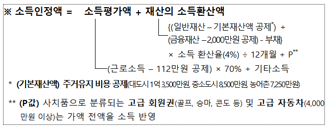 - 임대소득은 과세 대상이지만, 자택 거주는 일정 금액이 소득인정액 산정에서 제외됩니다.