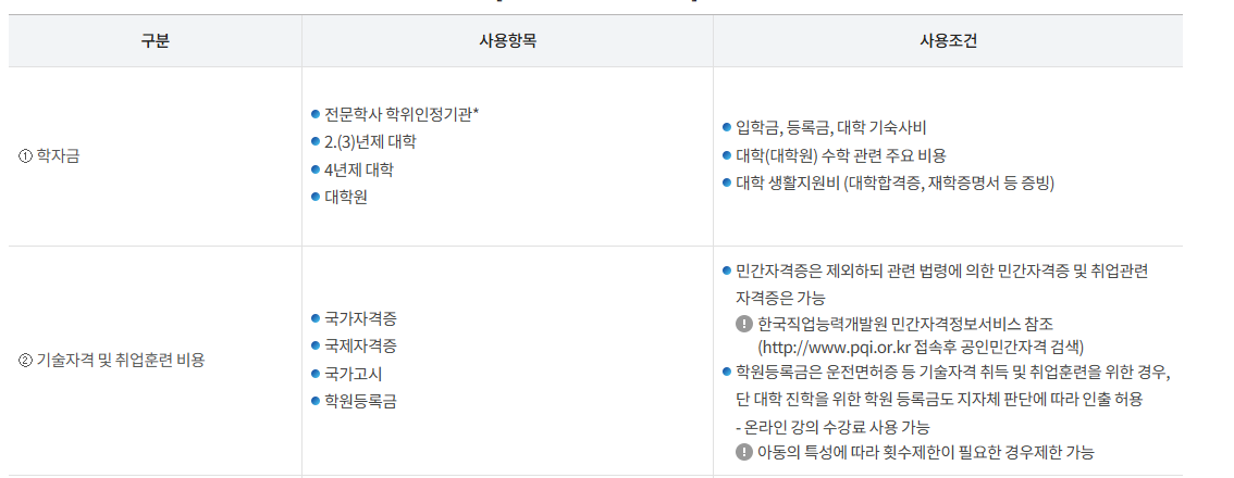 - 학업 비용: 대학 등록금, 학원비 등