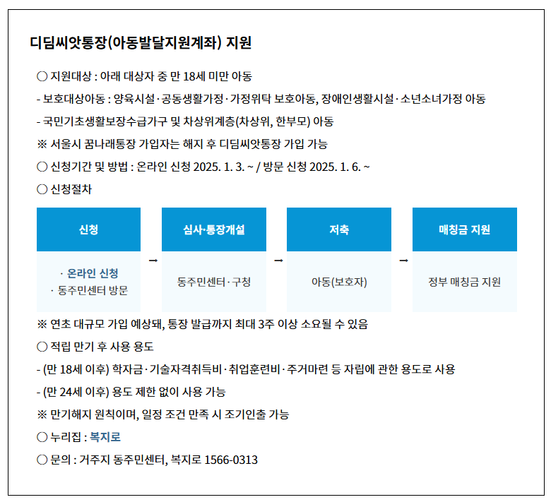디딤씨앗통장은 아동·청소년의 자립을 돕기 위해 정부와 개인이 함께 저축하는 자산형성 지원 제도입니다. 특히 취약계층 아동들에게 자산을 마련할 기회를 제공하며, 성인이 된 후 자립을 위한 중요한 발판이 됩니다.